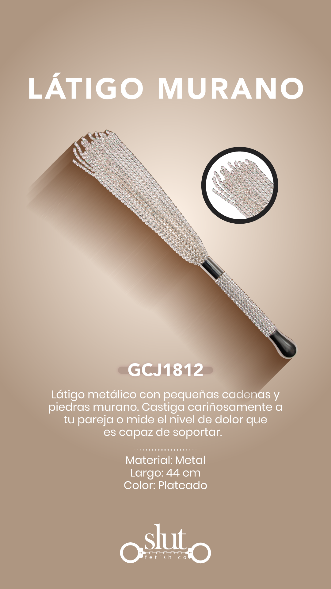 Látigo metálico con pequeñas cadenas y piedras murano para un toque chic.