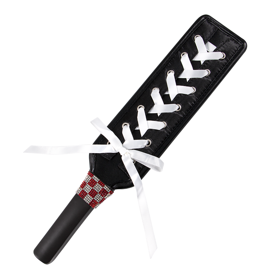 Paleta de nalgadas rígida con un pequeño cruce de cintas en su parte superior y una franja de muranos rojos y plateados en su agarre.