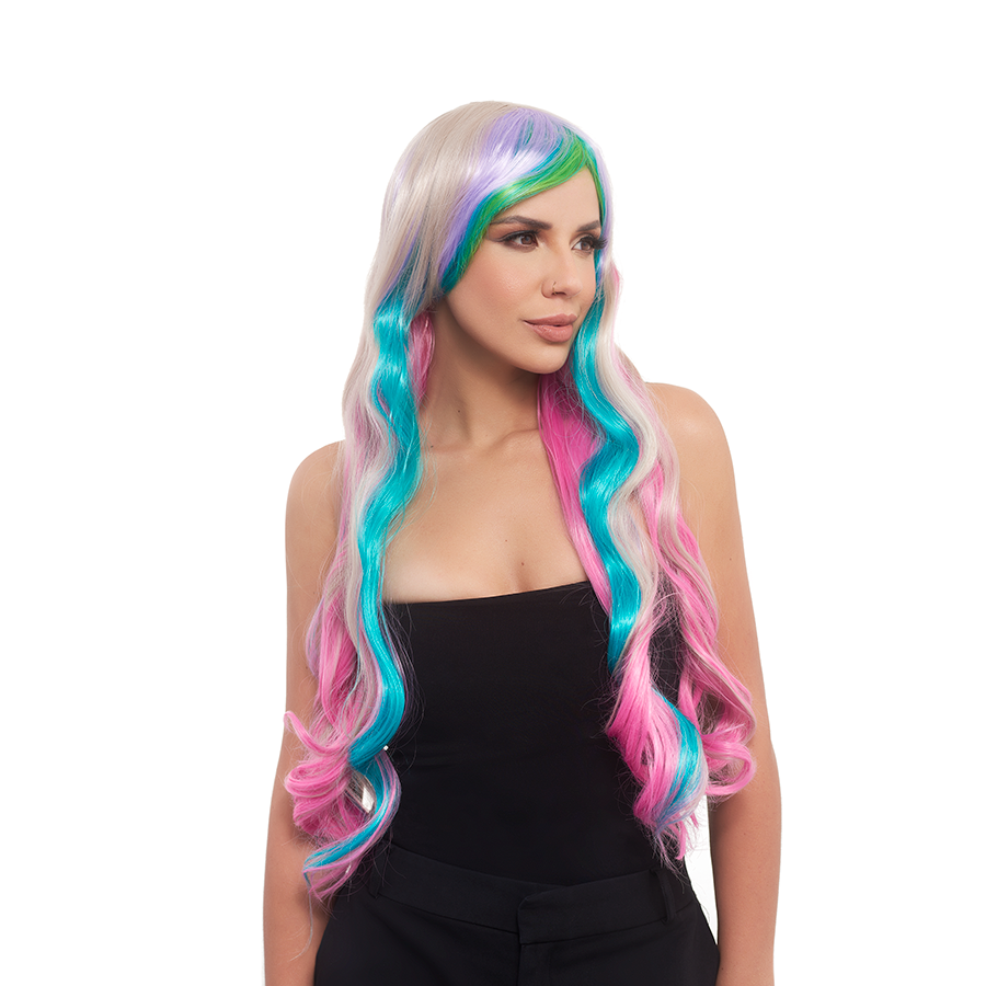 Esta peluca ondulada mezcla lo mejor del rubio radiante, el rosa dulce y el azul vibrante, creando un look que no pasa desapercibido.