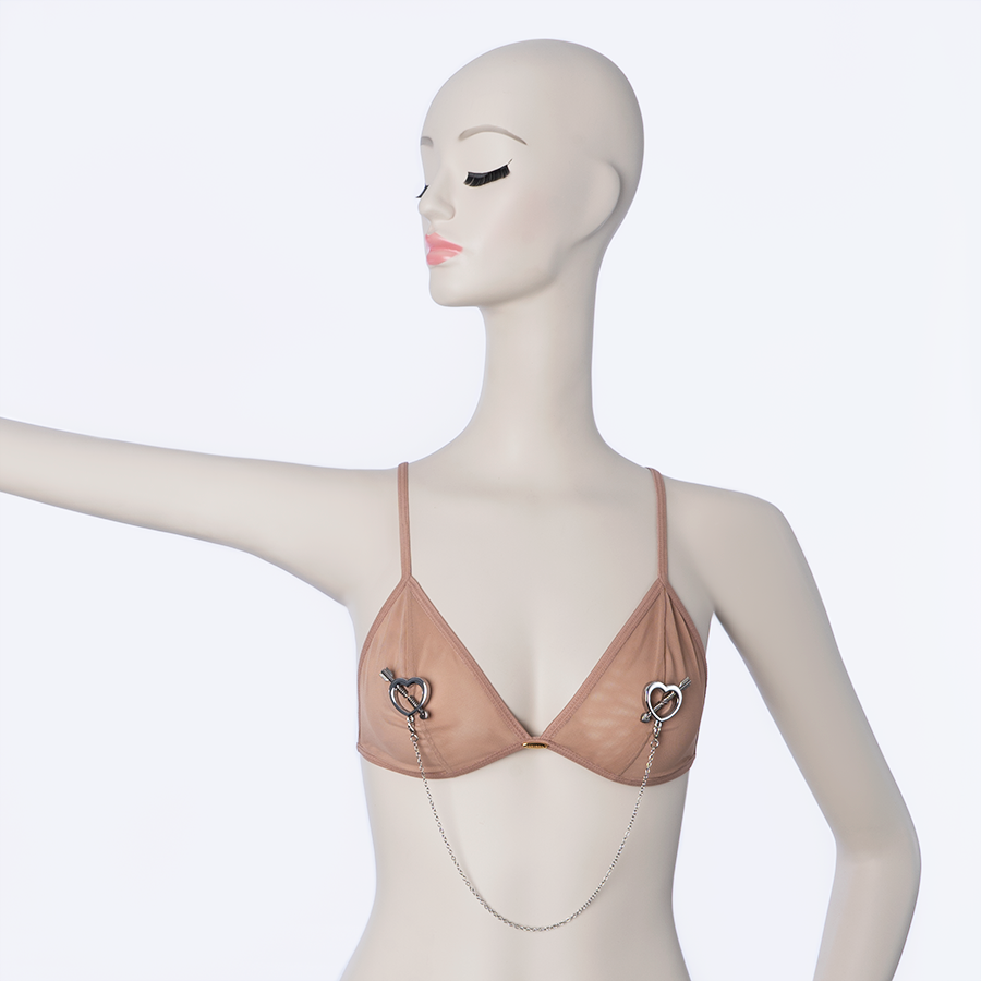 Pinza para los pezones, su diseño es de forma de corazón, tiene una pequeña flecha cruzada que se abre de cada extremo para quedar sostenida del pezón. En su extremo quedarán dos pequeños orificios para colocar una cadena decorativa.
